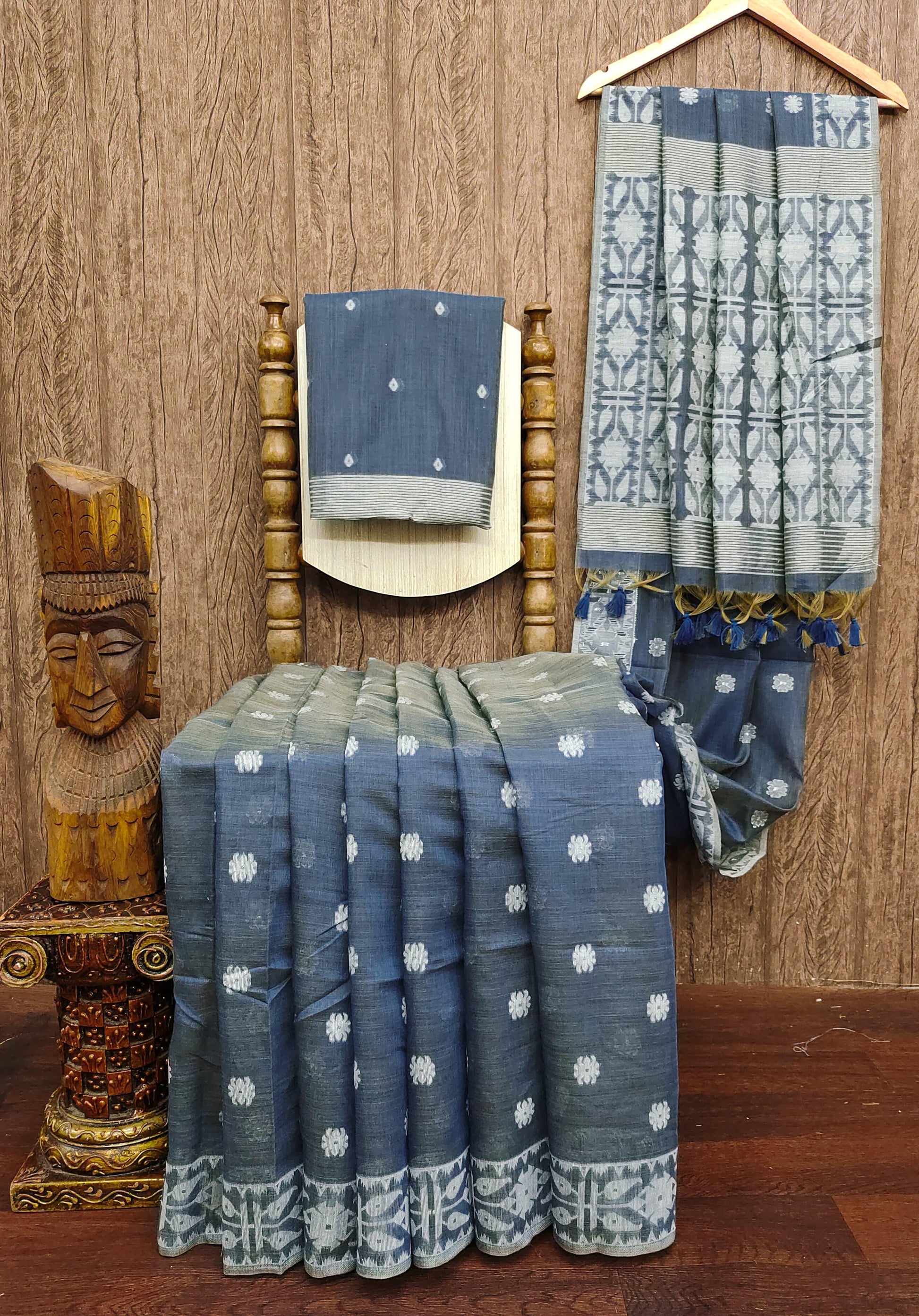 Grace your wardrobe with this premium soft Muga Cotton saree, designed in a timeless Jamdani concept. Adorned with delicate all-over weaving butties and finished with a contrast weaving border, this saree beautifully blends tradition with sophistication. Paired with a matching running blouse piece, it is a perfect choice for festive occasions, cultural events, and elegant day wear. 🌿